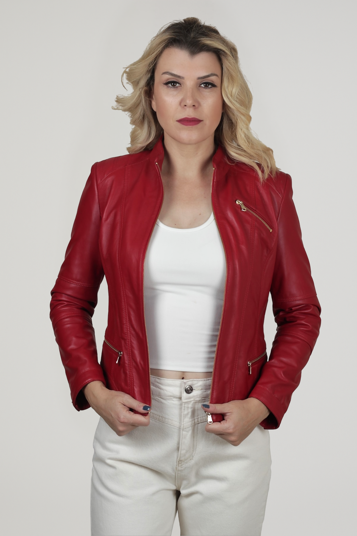 Öne Çıkan Özellikler: %100 hakiki deri, Canlı kırmızı renk, Dik yaka ve fermuarlı ön kapama, Üç adet fonksiyonel fermuarlı cep, Bel kısmında ayarlanabilir çıtçıtlı kemer detayı, İç astarlı yapı, Günlük ve özel kombinlerde rahat kullanım.