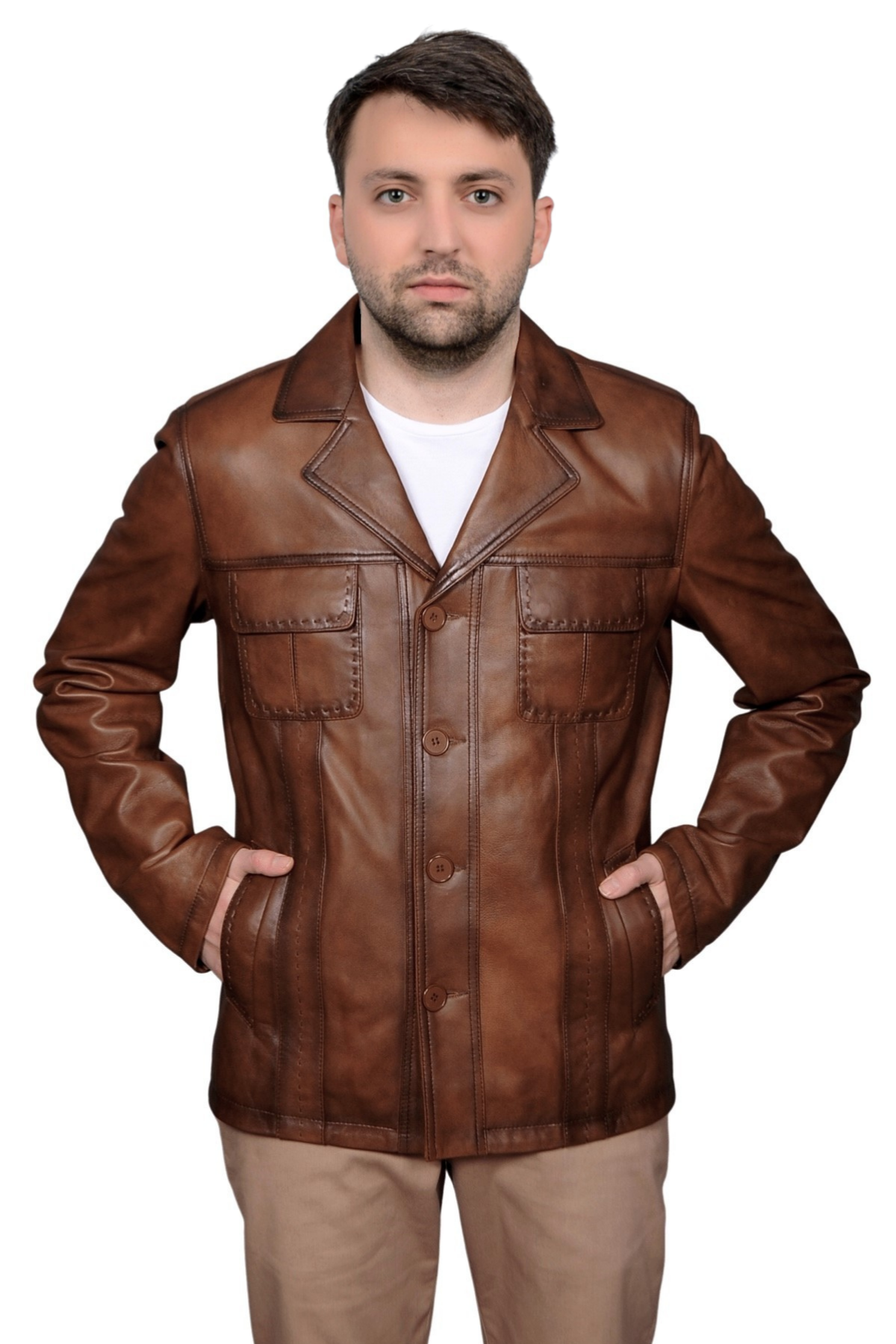 - Hakiki Deri Erkek Taba Ceket – Punto DikişliZamansız şıklığın ve kaliteli işçiliğin buluştuğu Derije Hakiki Deri Erkek Ceket, modern çizgileri ve fonksiyonel detaylarıyla stilinizi tamamlıyor. %100 hakiki deriden üretilen bu özel tasarım, dayanıklılığı ve doğal dokusuyla uzun yıllar kullanım sunar. Slim kesimi sayesinde vücuda tam oturur, hareket özgürlüğü sağlar ve her bedende şık bir duruş sunar. Ceket yaka detayıyla modern ve maskülen bir görünüm elde edilirken, taba renginin sıcak tonları her kombine uyum sağlar. İç kısmında yer alan nefes alabilen, terletmeyen astar, gün boyu ferahlık sunar. Aynı zamanda iç kısımda iki geniş iç cep ve özel telefon cebi, hem konfor hem de işlevsellik sağlar. Hassas punto dikiş detayları cekete zarif bir dokunuş katıyor.
