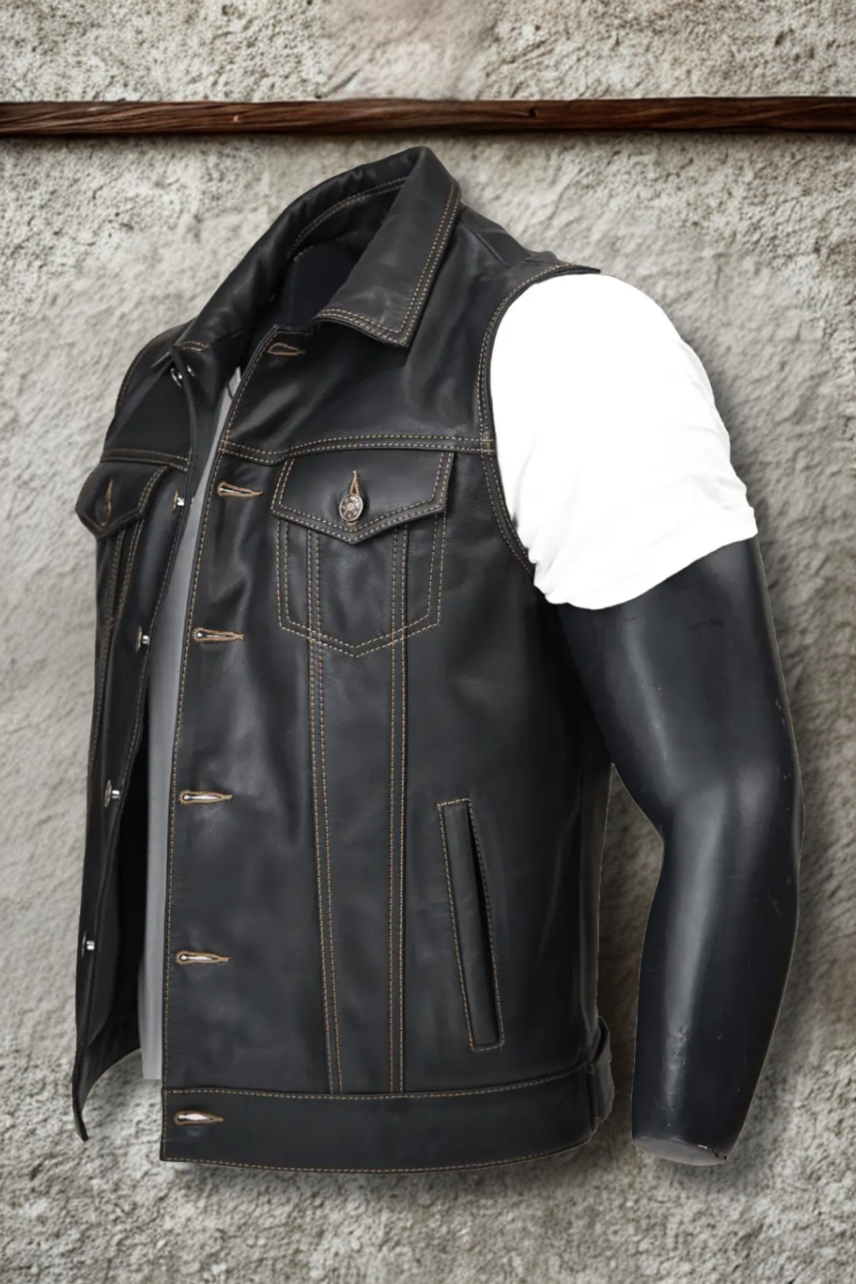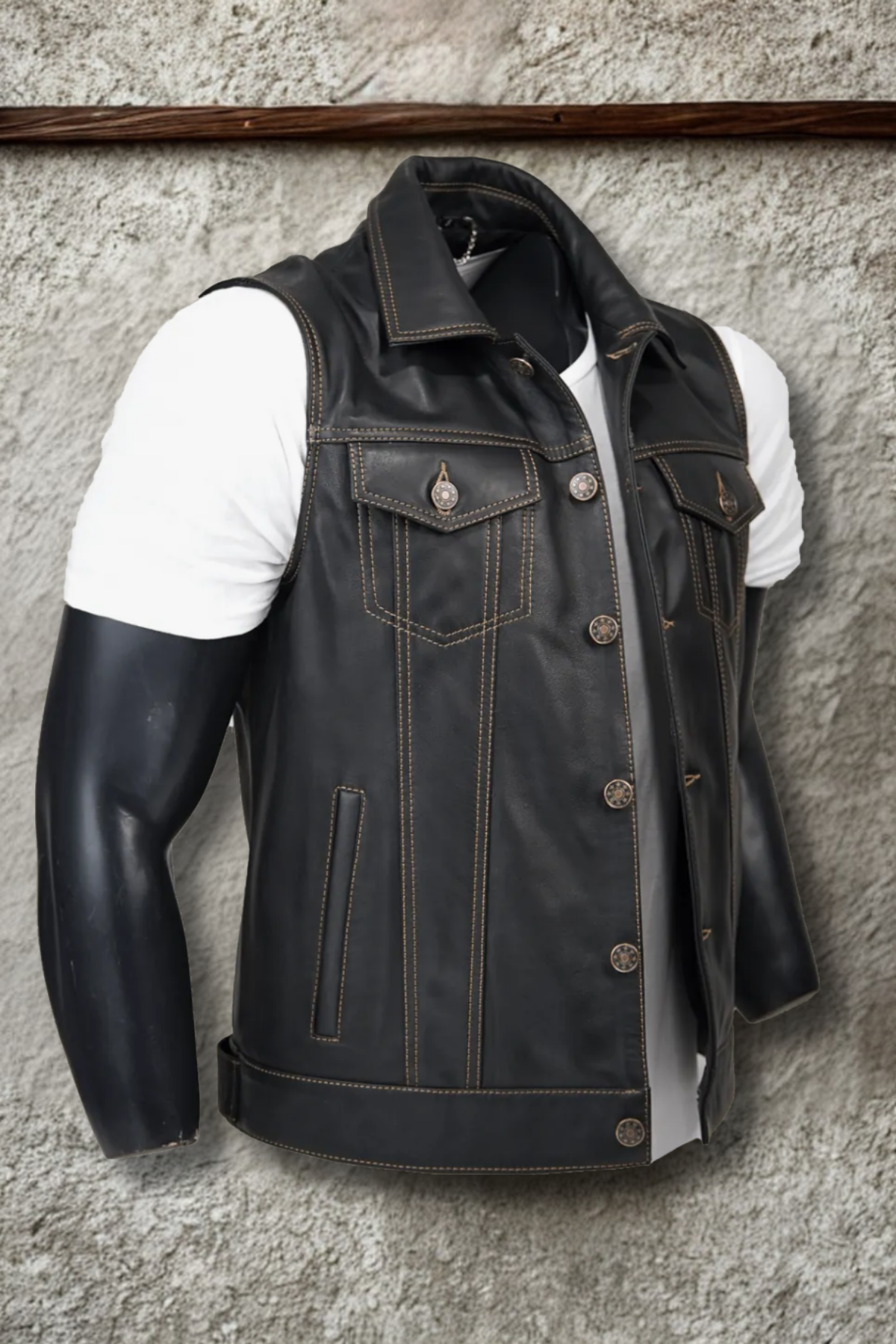 Maksimum tarz ve sağlamlık arayanlar için tasarlandı: Derije'nin hakiki deriden ürettiği bu siyah motorcu tarzı erkek yelek, hem klasik görünüm hem de fonksiyonelliği bir arada sunuyor.