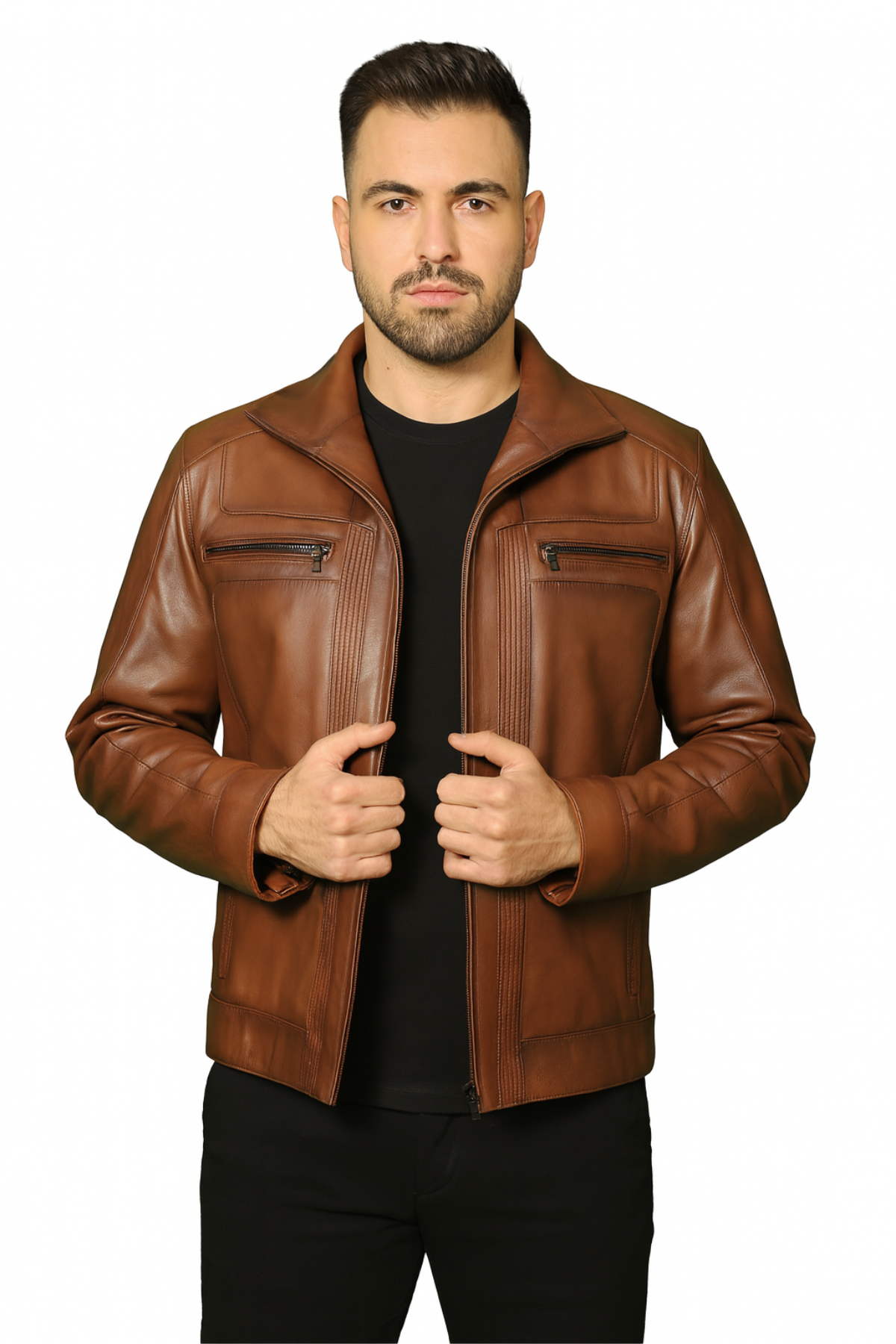 Özellikler: Hakiki deri malzeme, regular fit kalıp, iki fermuarlı göğüs cebi, iki yan cep, kaliteli metal fermuarlar, klasik yaka tasarımı.