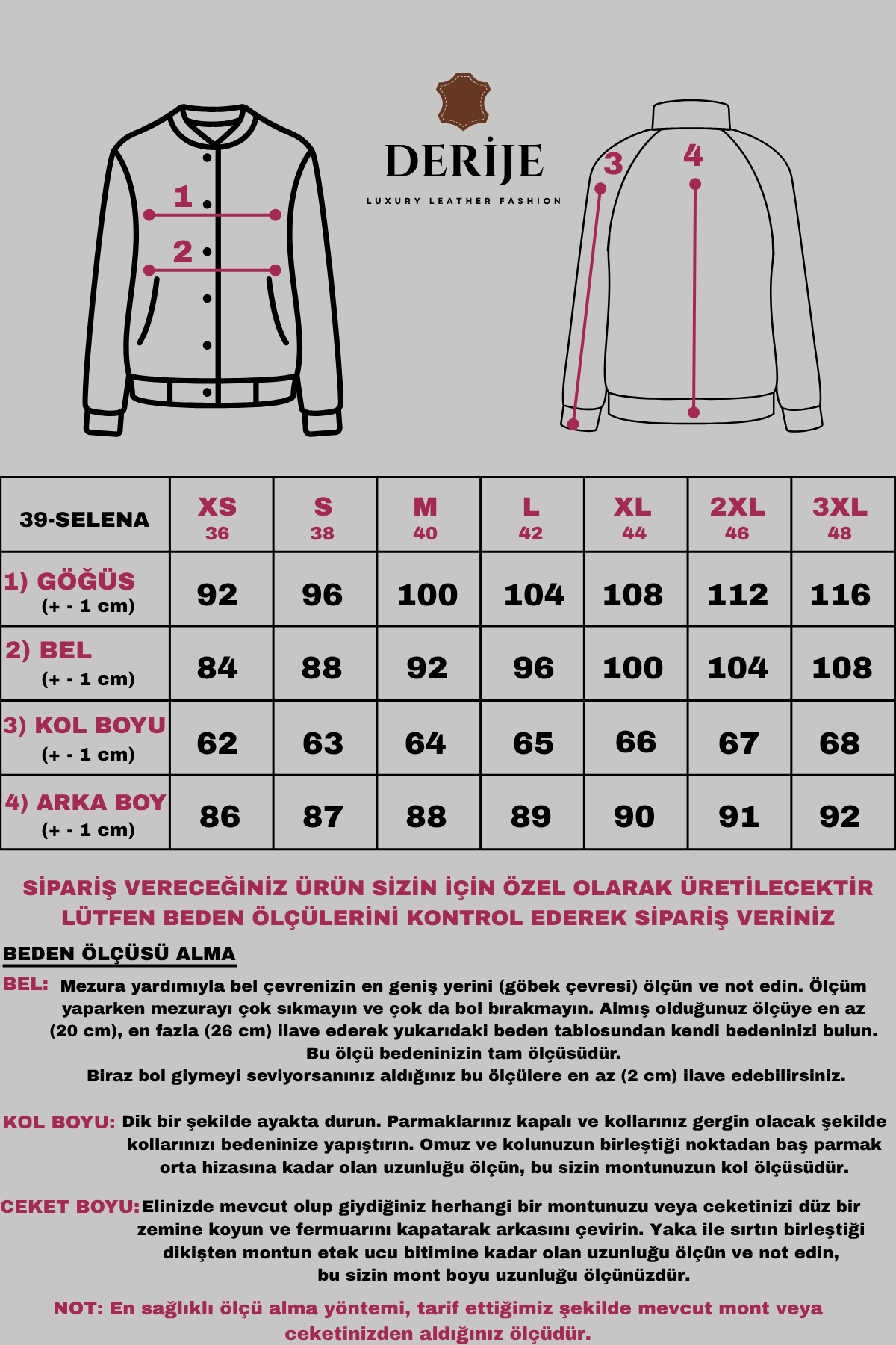 Bütün ürünler yüksek kalite hakiki deriden özenle üretilir ve DERİJE garantisindedir.