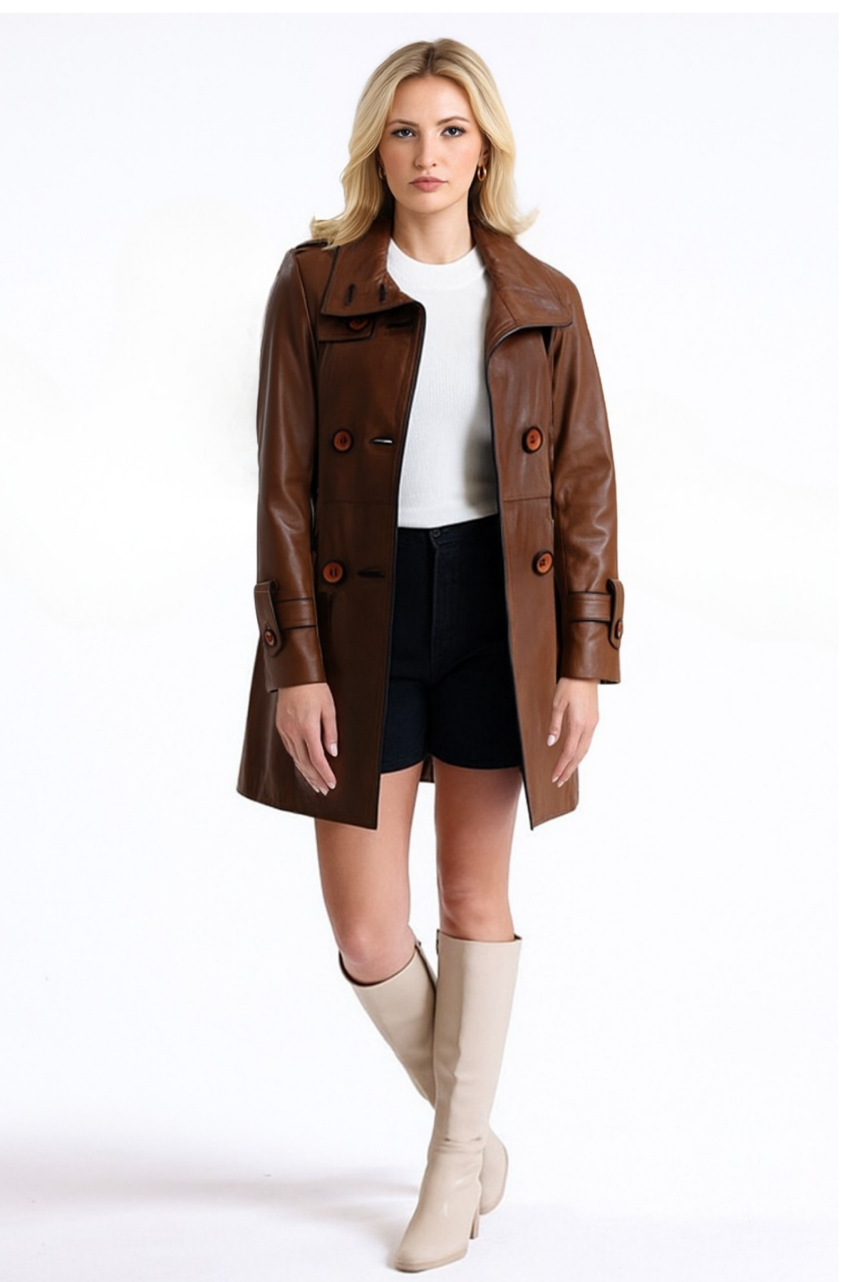 Taba rengiyle fark oluşturan bu trençkot; şehir hayatında, seyahatte ya da özel anlarda şıklığınızı tamamlayacak güçlü bir parçadır. Doğal deri dokusu her kullanımda kişisel bir patina kazanarak zamanla daha da güzelleşir.