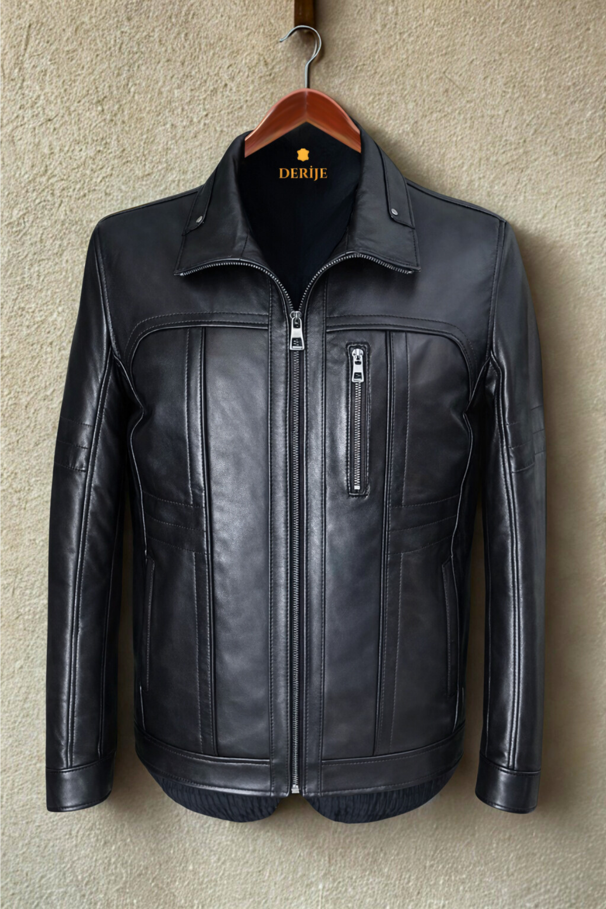 Ceketin rahat kesimi ve iç kısmında yer alan nefes alabilen astar, gün boyu rahatlık ve ısı dengesi sağlarken, iki adet iç cep ve ayrıca bir telefon cebi, eşyalarınızı güvenle taşımanıza yardımcı olur. Ön kısmında yer alan sağlam fermuar kapama, tasarıma fonksiyonel ve modern bir dokunuş katar. Hem günlük stilinizde hem de özel anlarda fark oluşturacak bu siyah deri ceket, Derije’nin el işçiliği ve zamansız tasarım anlayışını yansıtır. Bu şık ceket, soğuk kış günlerinde stilinizden ödün vermeden sıcak kalmanızı sağlar.