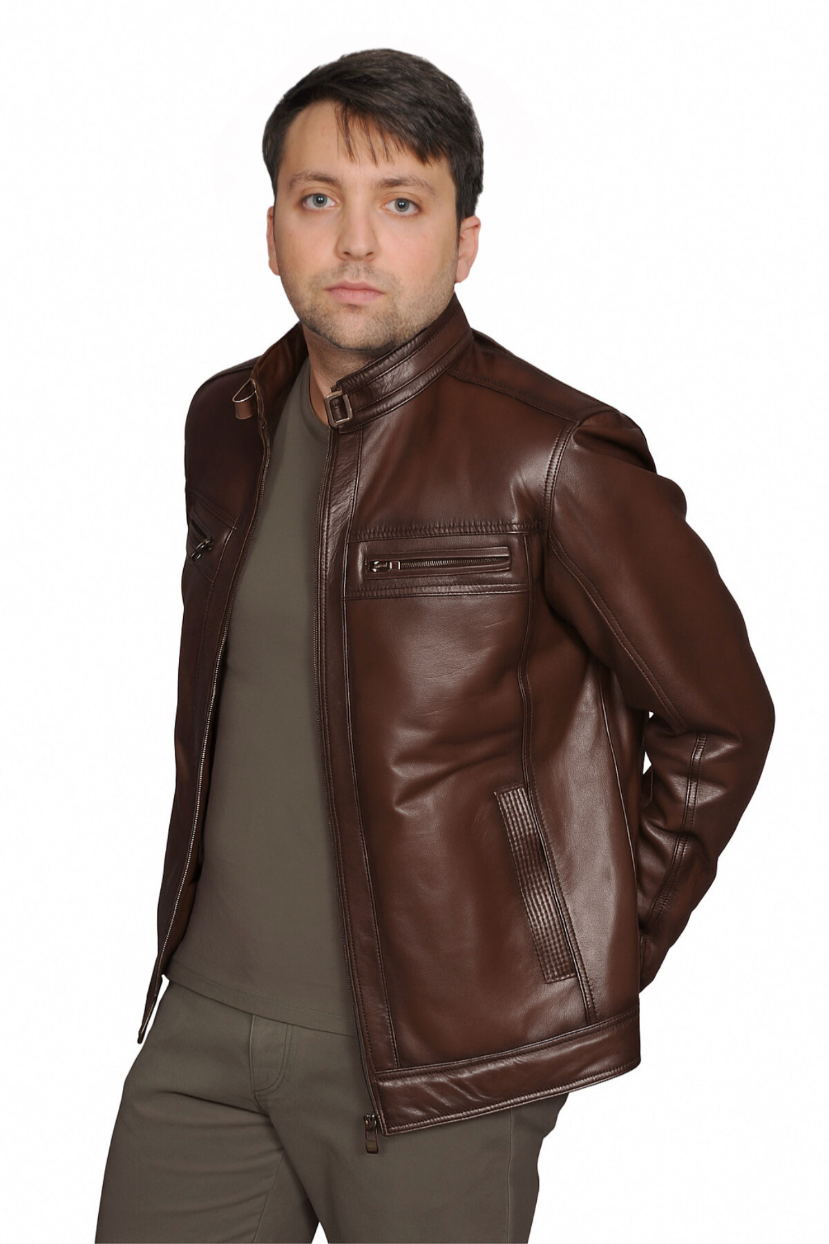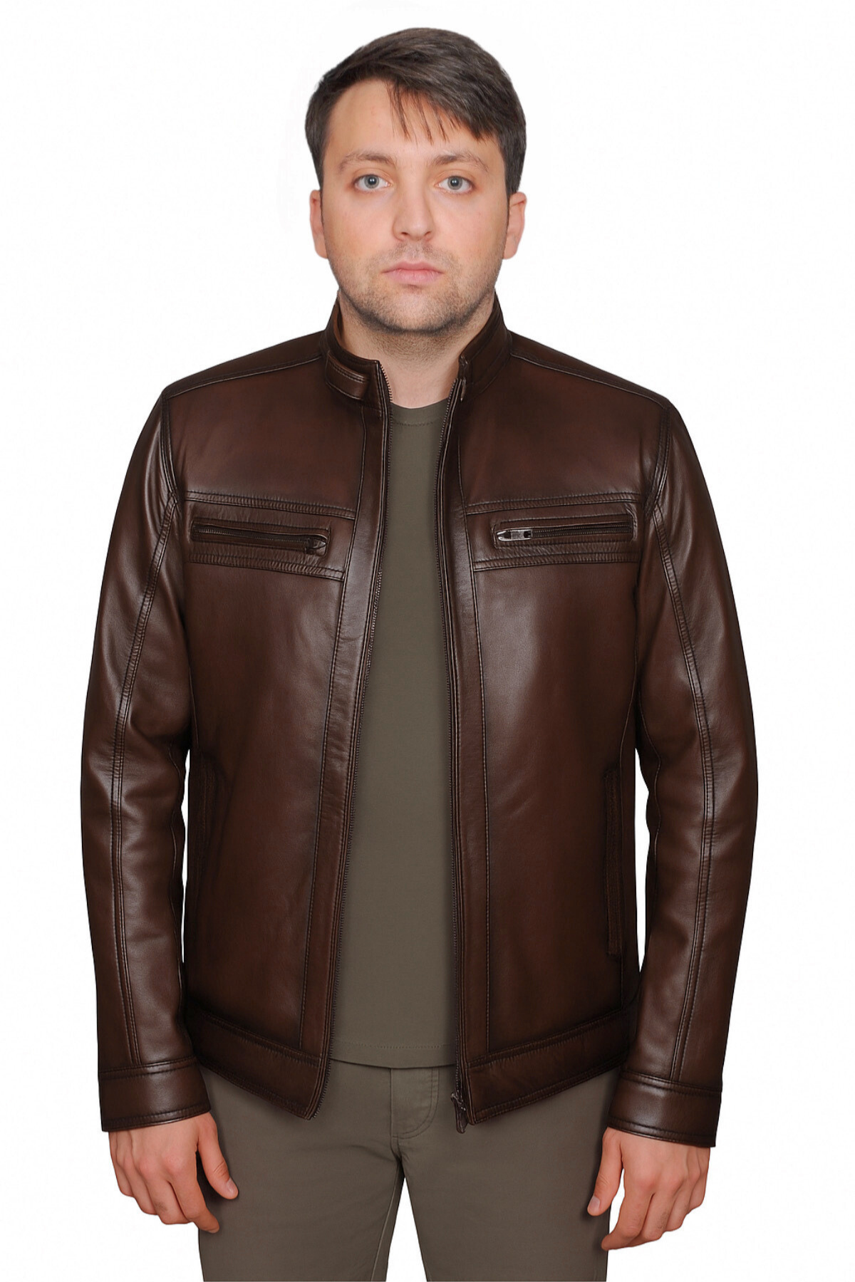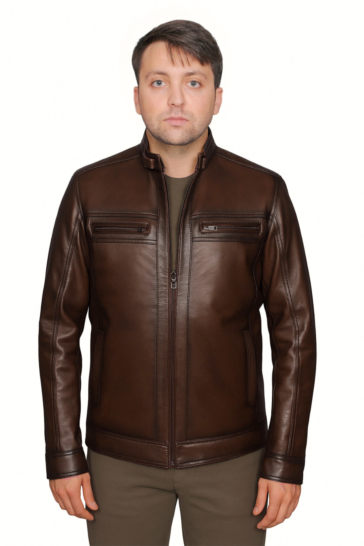 Derije Hakiki Deri Erkek Kahverengi Dik Yaka Ceket – Regular Kalıp