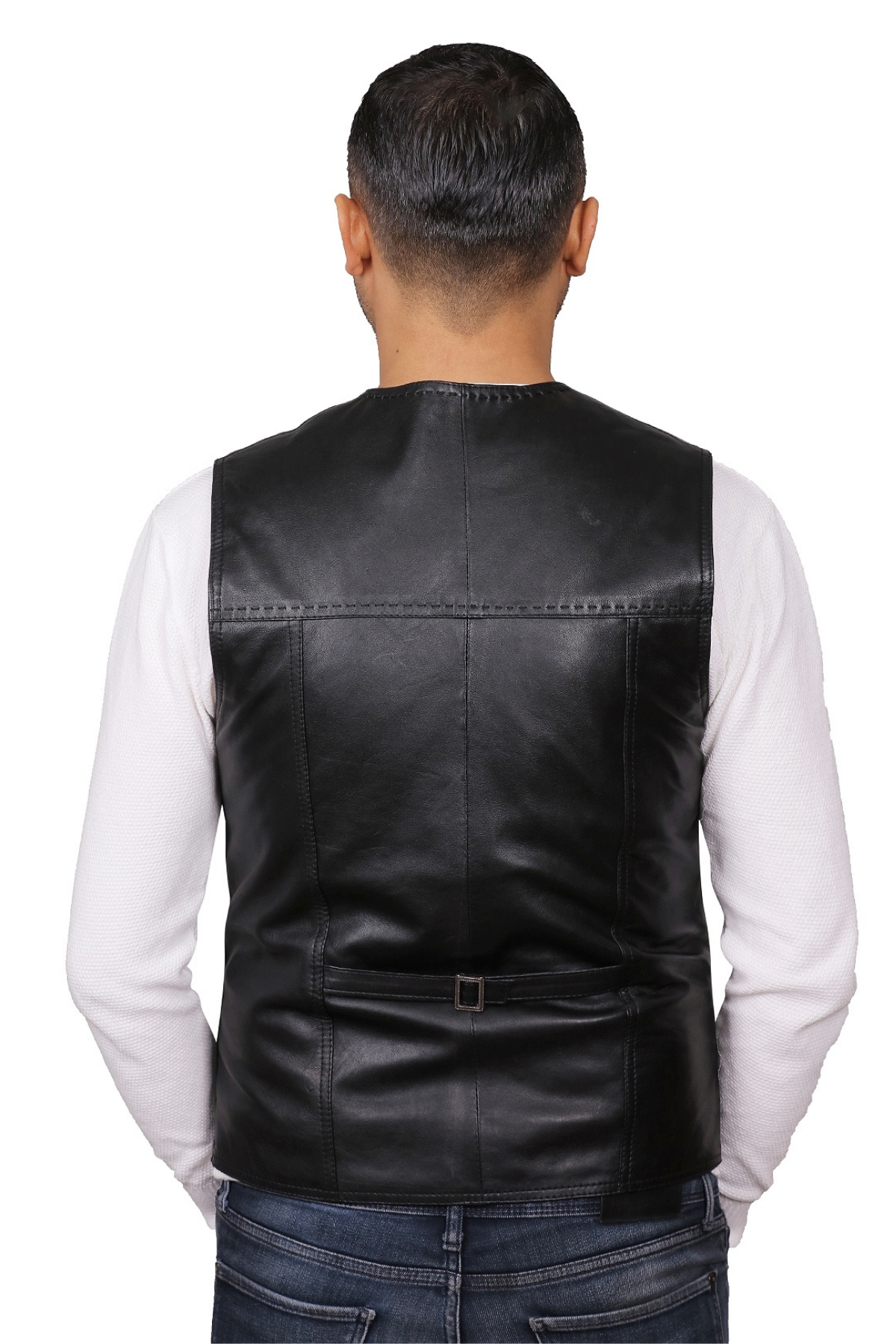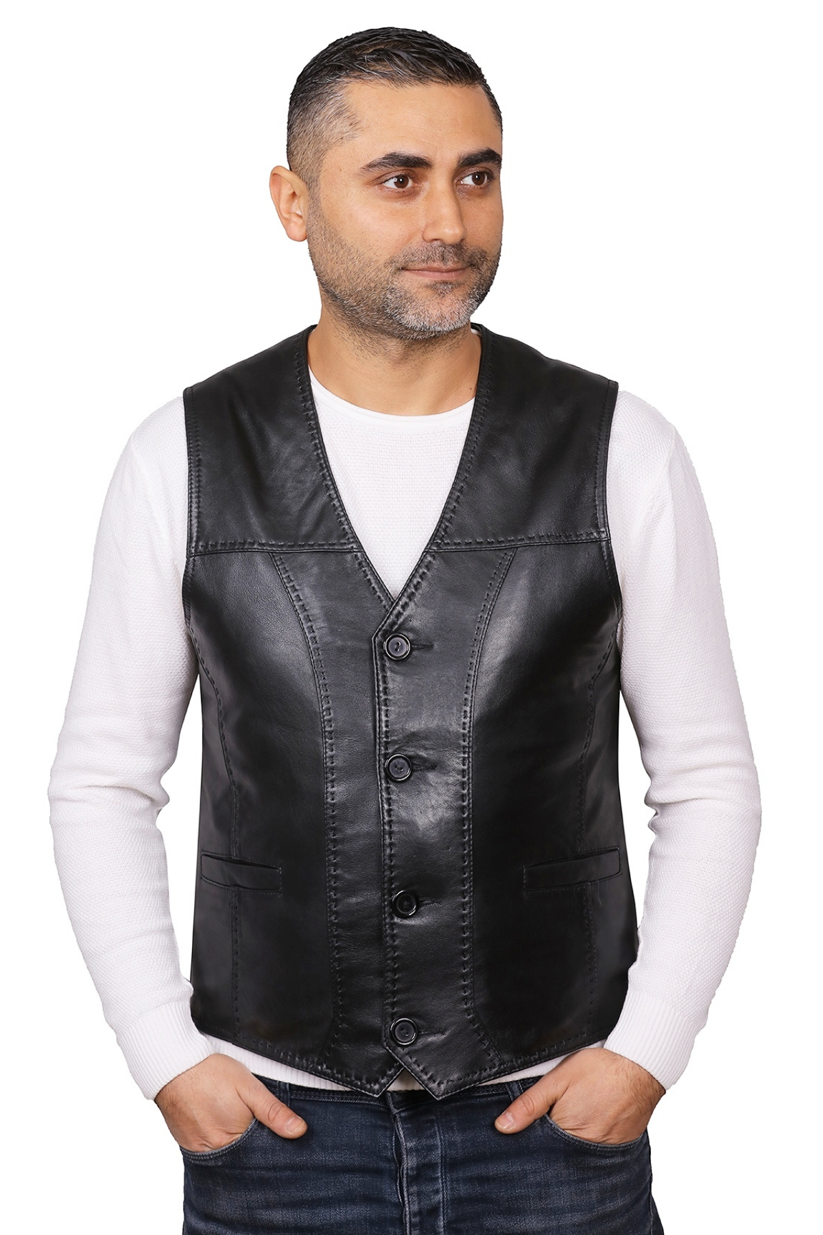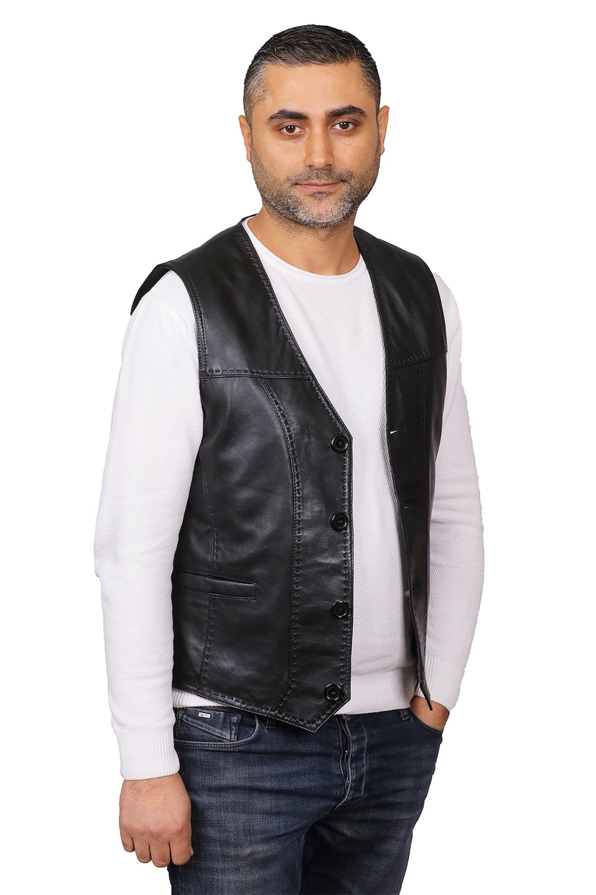 Hakiki Deri Erkek Siyah Punto Dikişli Yelek