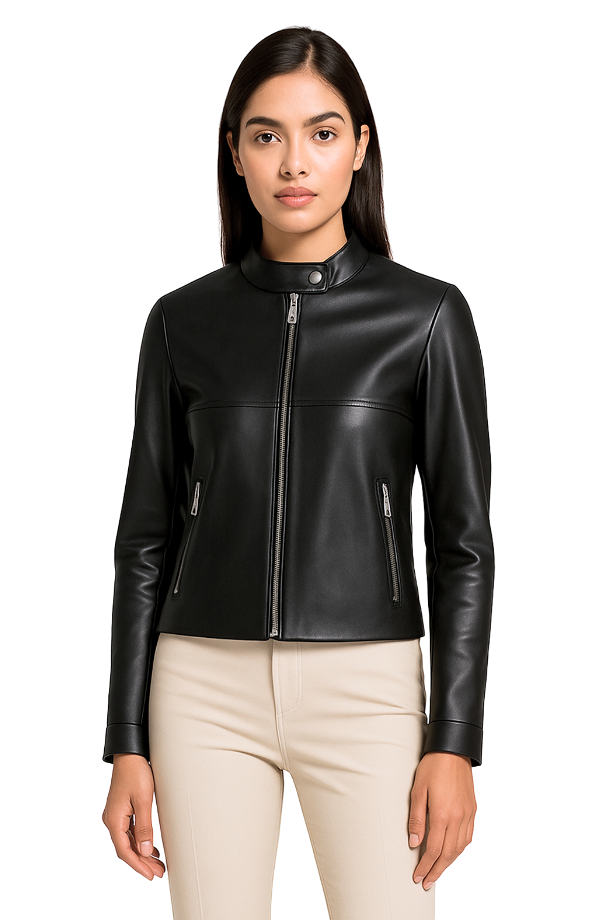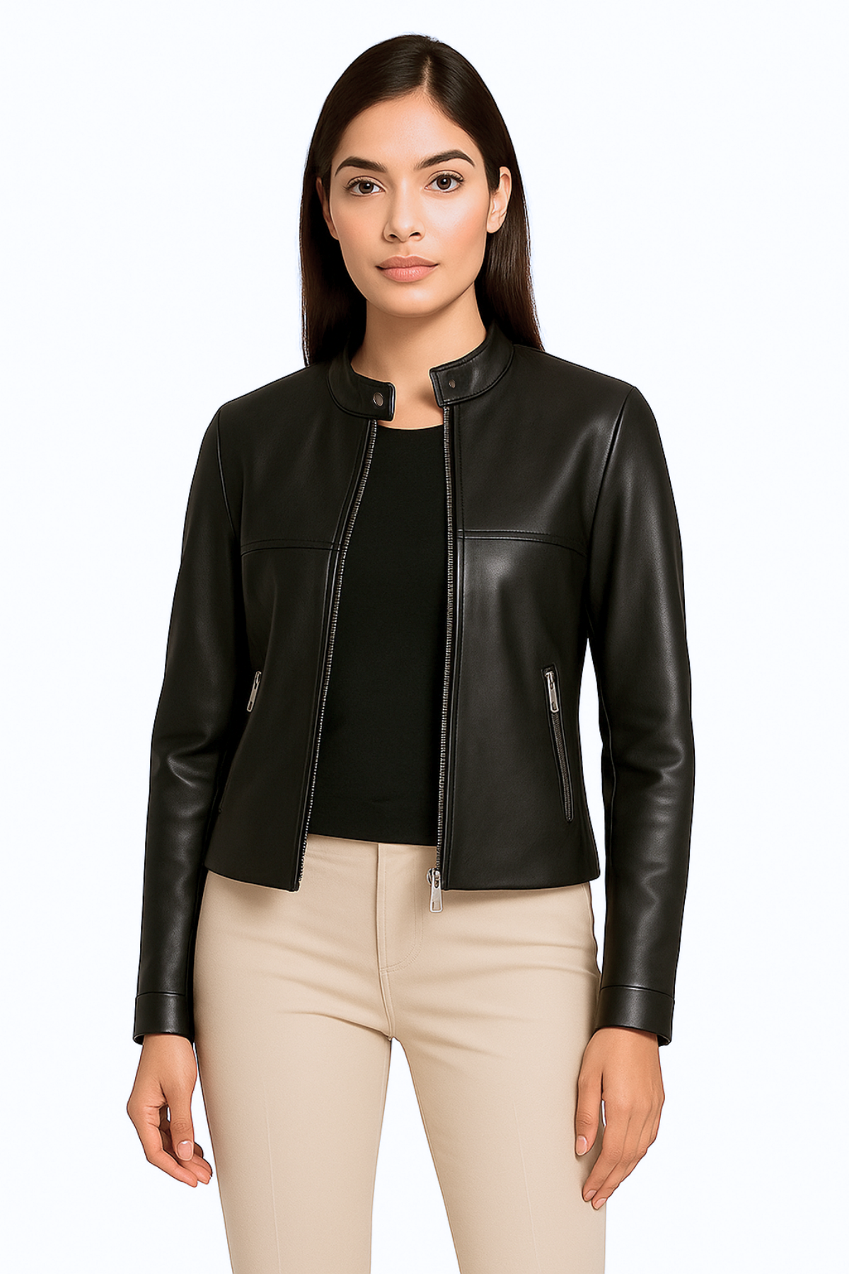 - Zamansız şıklık sunan bu siyah kadın deri ceket, fermuarlı cepleri ve sade kesimiyle stilinize güçlü bir dokunuş katar.